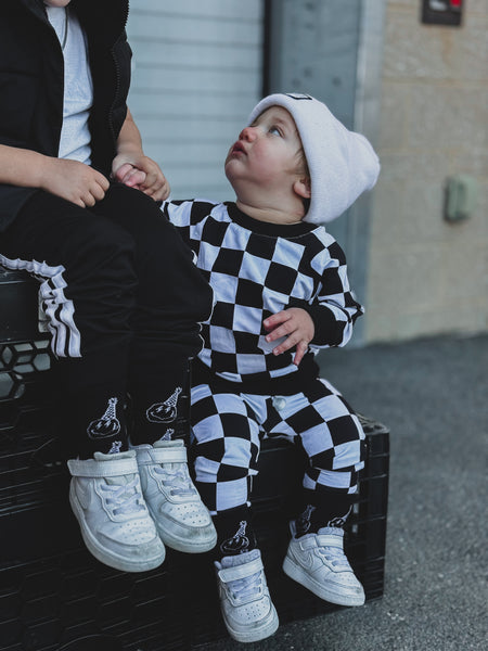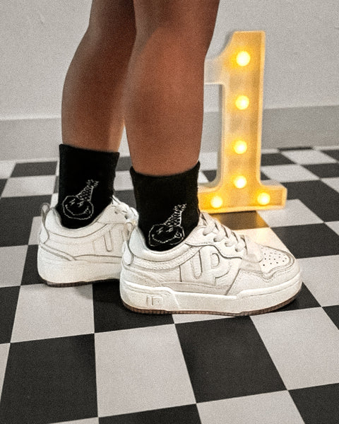 Sizes Infant, Extra Small, Small, Medium have logo grips on the bottom of the feet large have a stitched logo on the bottom of the feet.