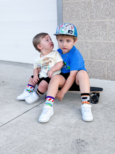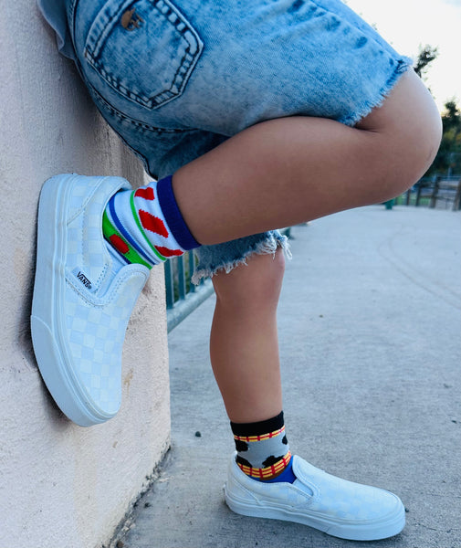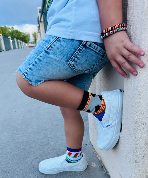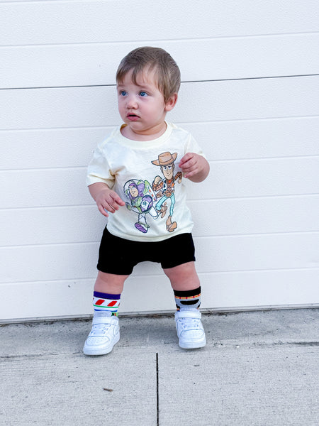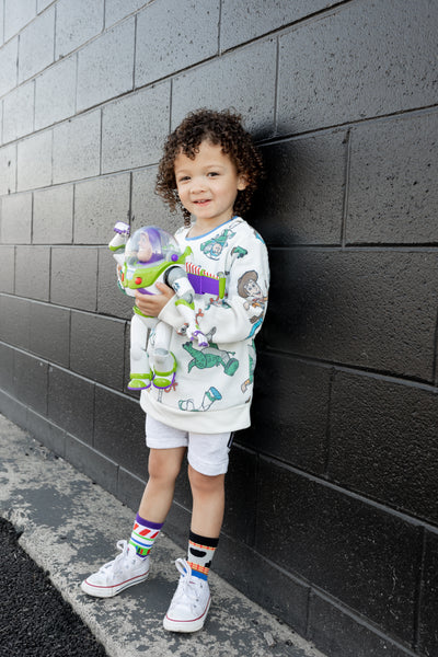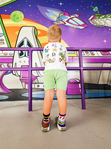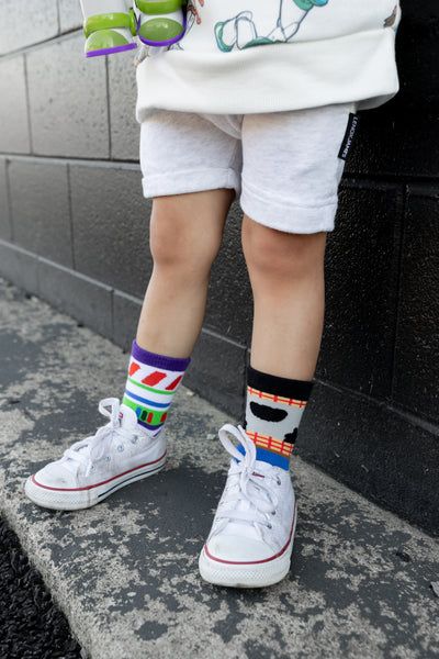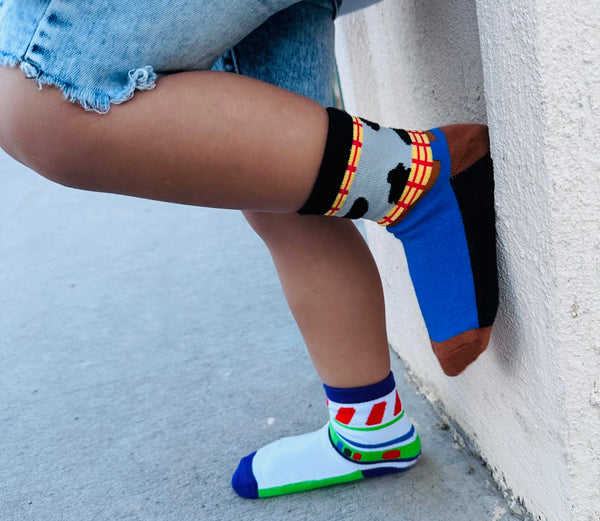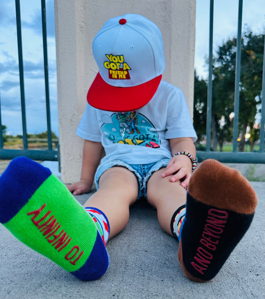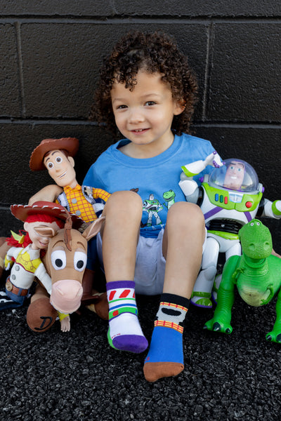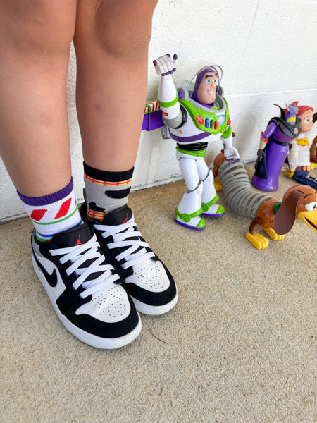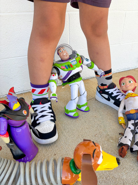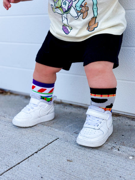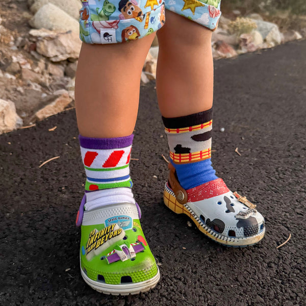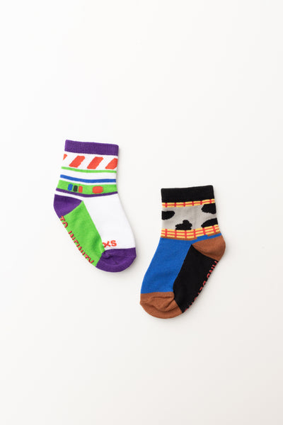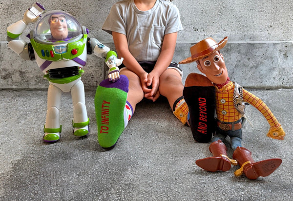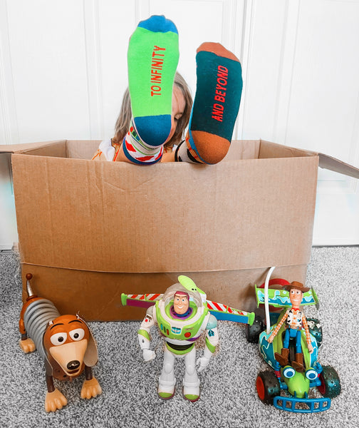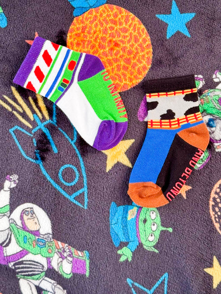 Sizes Infant, Extra Small, Small, Medium have "too infinity" "and beyond" on the bottom of the feet large have a stitched "too infinity" "and beyond" on the bottom of the feet.
